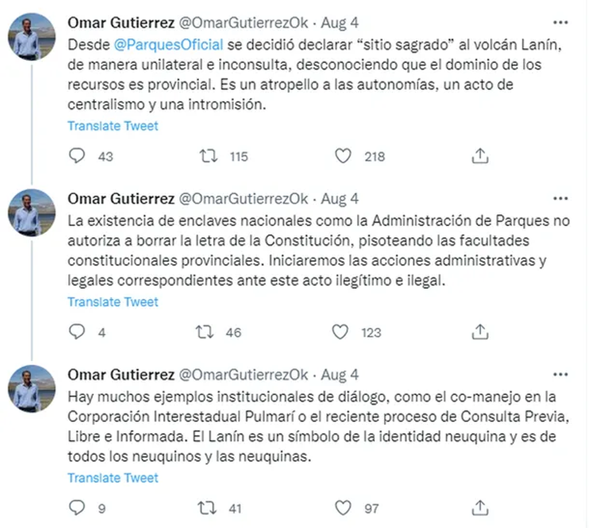 Sin embargo, el gobernador de Neuquén, Omar Gutiérrez calificó ayer como “unilateral e inconsulta" esa resolución y aseguró que era "un atropello a las autonomías provinciales, un acto más de centralismo y una intromisión”.