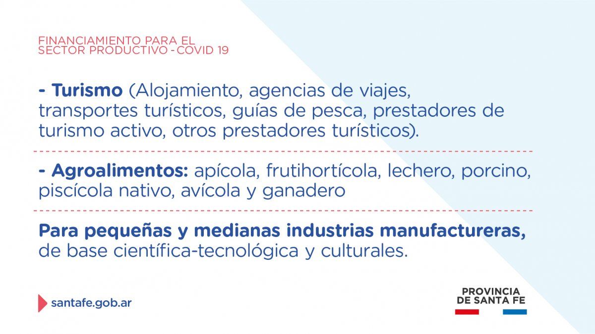 Las medidas estarán destinadas a los siguientes sectores: turístico afectado, apícola, frutihortícola, lechero, porcino, piscícola nativa, avícola, plan Ganadero, sector productivo algodonero y ovino; y sector productivo industrial. También serán beneficiarias las pequeñas y medianas industrias manufactureras, de base científica-tecnológica y culturales del territorio santafesino, el teletrabajo y el e-commerce.