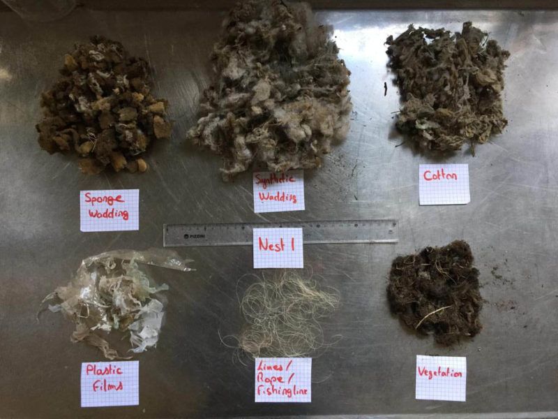 Para completar un escenario más bien oscuro, el investigador contó que también han registrado contaminación por plásticos en nidos de aves en los que encontraron fragmentos de guata sintética (poliéster), bolsas (polietileno), tanzas de pesca (nylon) y goma espuma (espuma de poliuretano). “Los resultados hasta el momento sugieren que hasta el 90% de la cámara de incubación de estos nidos está construida con residuos plásticos y que sólo el 10% restante son materiales naturales como pasto seco, paja, etc” describió Bletter.