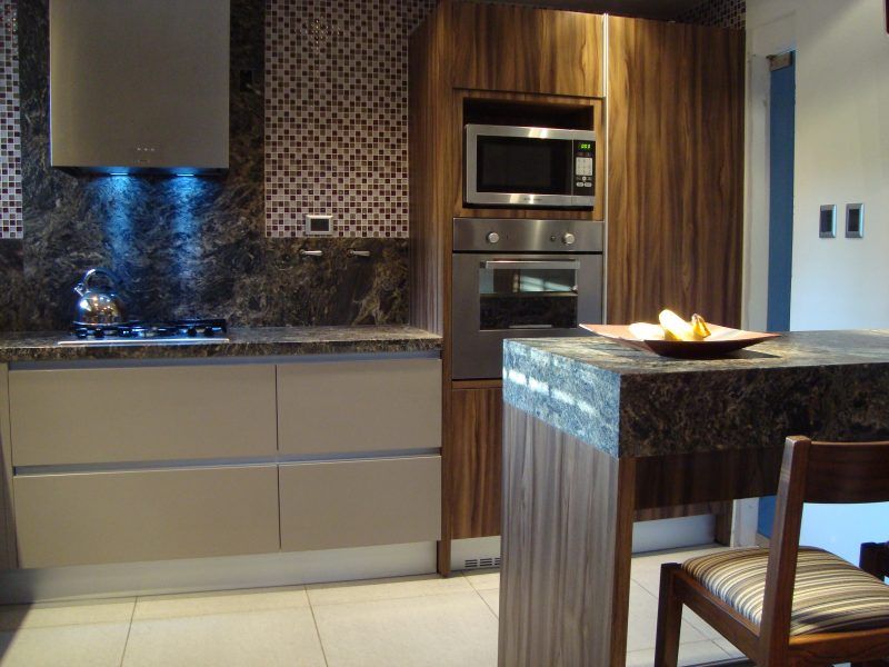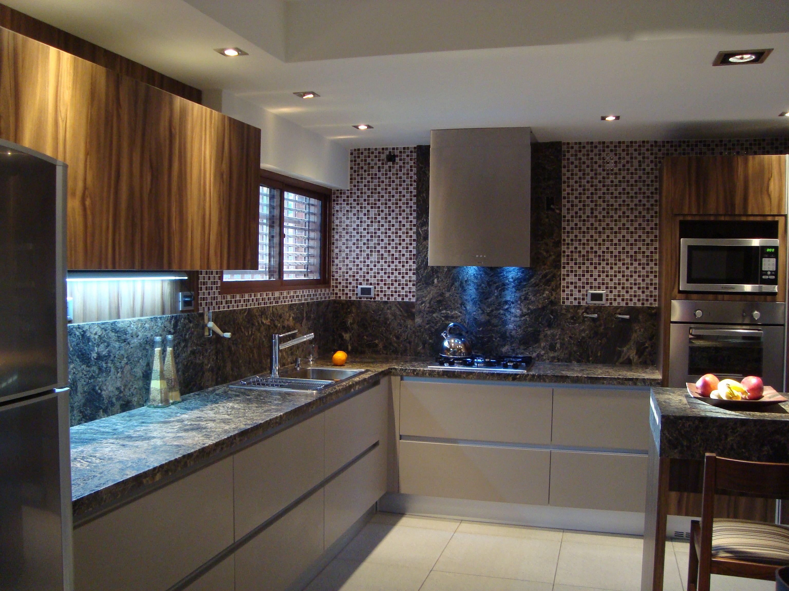 La cocina, que responde a la misma gama cromática, destaca la madera y la combinación del color como elementos primordiales, dialogando con el acero y el granito gris mara de la mesada.