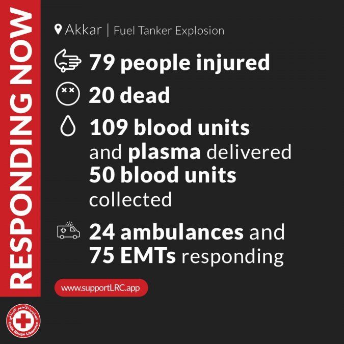Al menos 20 personas murieron y siete resultaron heridas tras una explosión de un camión cisterna que transportaba combustible en el distrito de Accar, en el norte de Líbano, informó la Cruz Roja en su cuenta de Twitter. El organismo destacó que transportó en sus equipos a los hospitales de la zona "a 20 cadáveres".