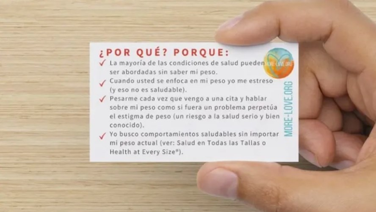 En ese sentido, en el dorso de la tarjeta se explica: "La mayoría de las condiciones de salud pueden ser abordadas sin saber mi peso".