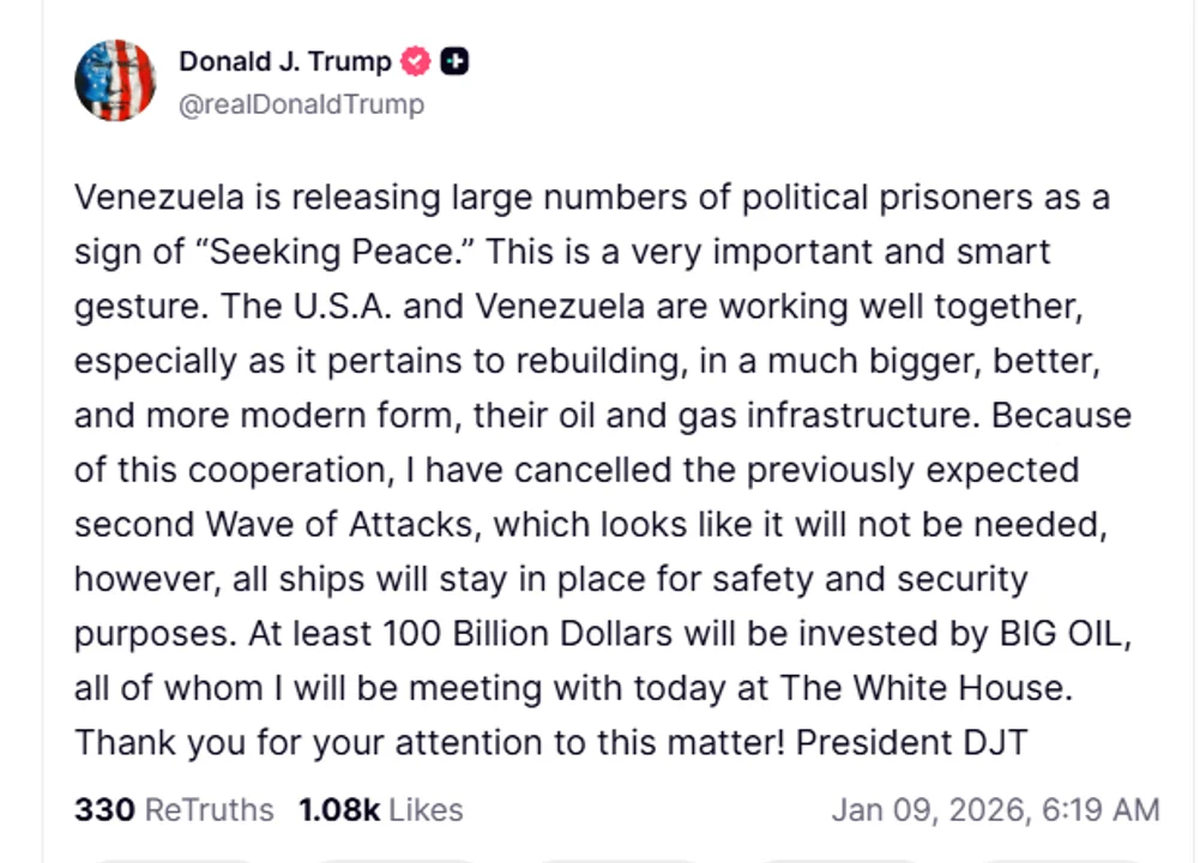 Estados Unidos y Venezuela están colaborando eficazmente, especialmente en la reconstrucción, de una forma mucho mayor, mejor y más moderna, de su infraestructura de petróleo y gas. Gracias a esta cooperación, cancelé la segunda ola de ataques, prevista previamente, que parece innecesaria", expresó el mandatario.