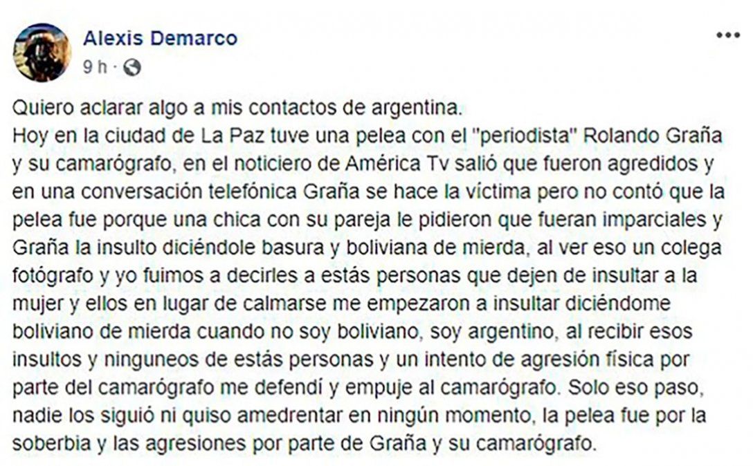 “Quiero aclarar algo a mis contactos de Argentina. Hoy en la ciudad de La Paz tuve una pelea con el “periodista” Rolando Graña y su camarógrafo, en el noticiero de América TV salió que fueron agredidos y en una conversación telefónica Graña se hace la víctima pero no contó que la pelea fue porque una chica con su pareja le pidieron que fueran imparciales y Graña la insultó diciéndole basura y boliviana de mierda”, escribió.