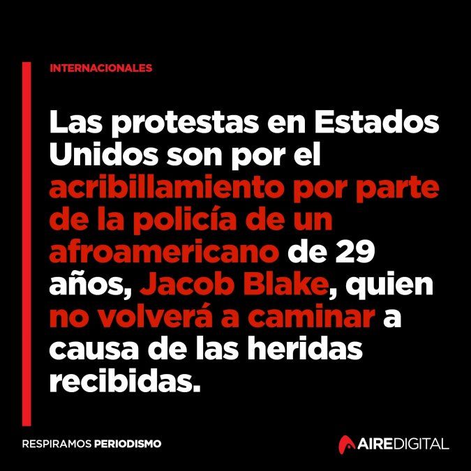 Desde hace tres noches, Kenosha es escenario de fuertes protestas luego de que policías hirieran de gravedad a Blake el domingo pasado en un incidente que también fue captado en video por un testigo con su teléfono celular.