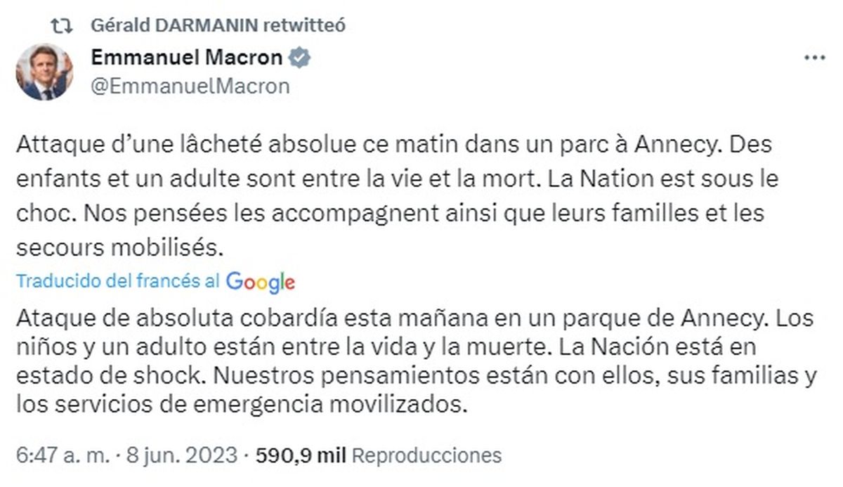 "Los niños y un adulto están entre la vida y la muerte. La nación está en estado de shock", dijo el presidente francés, Emmanuel Macron, en un comunicado en Twitter, calificando el ataque como "un acto de absoluta cobardía".