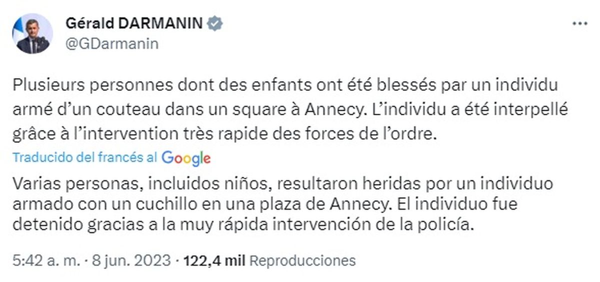 El ministro del Interior francés, Gerald Darmanin, dijo en Twitter que el atacante había sido arrestado.