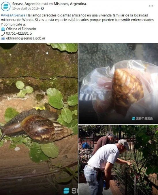 “Este tipo de caracol puede ser portador de nematodos (parásitos) que son perjudiciales para la salud humana. Por eso se recomienda no tocarlos y manipularlos con precaución. Desde el punto de vista del medio ambiente también son muy nocivos porque debido a su velocidad de reproducción y su falta de predadores naturales pueden constituirse en una plaga en muy poco tiempo. Y como tienen un crecimiento muy rápido y comen cualquier cosa pueden constituirse en un peligro para los cultivos”, explicó Emilio Rey, del Senasa.