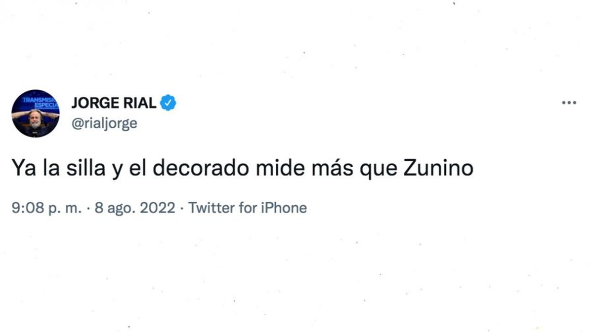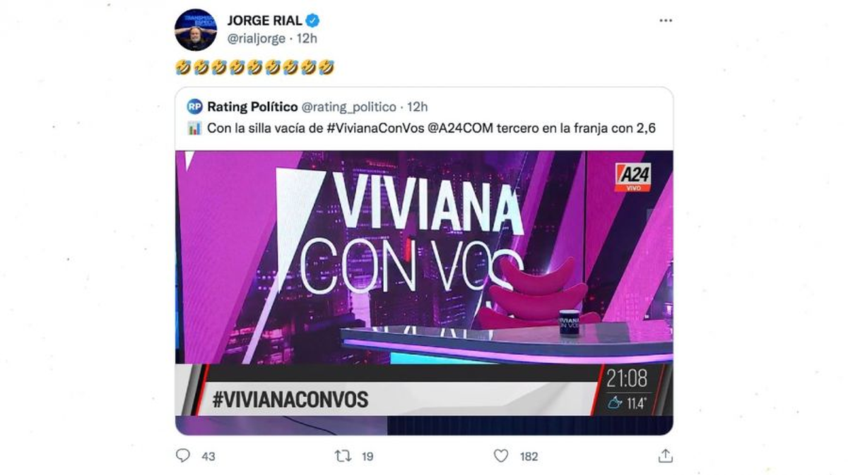 Al comienzo del programa de Canosa, el periodista tuiteó filoso contra Edi Zunino, cuyo programa es el que precede a la franja horaria que le correspondía a Viviana: "Ya la silla y el decorado mide más que Zunino". Luego, Rial retuiteó una foto del estudio de "Viviana con Vos" (A24) vacío y sumó varios emojis de risas.