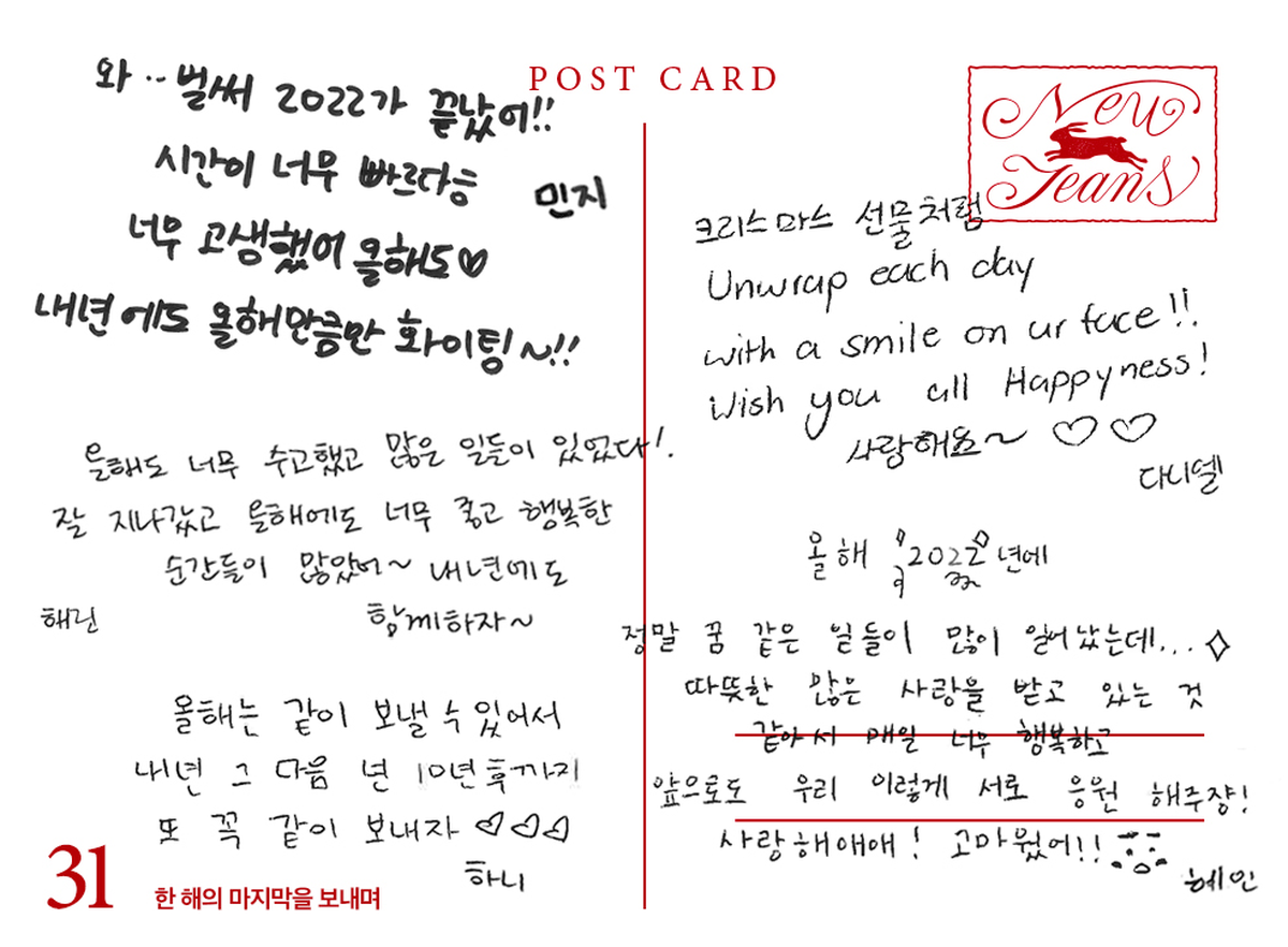"Guau... ¡2022 ya terminó! El tiempo pasa tan rápido. Ustedes también trabajaron duro este año. ¡Luchemos el próximo año tanto como lo hicimos este año!", escribió Minji. Mientras que Haerin agregó: "Ustedes también trabajaron duro este año y pasaron muchas cosas este año. Pasó bien y también hubo muchos momentos buenos y felices. Estemos juntos el próximo también".