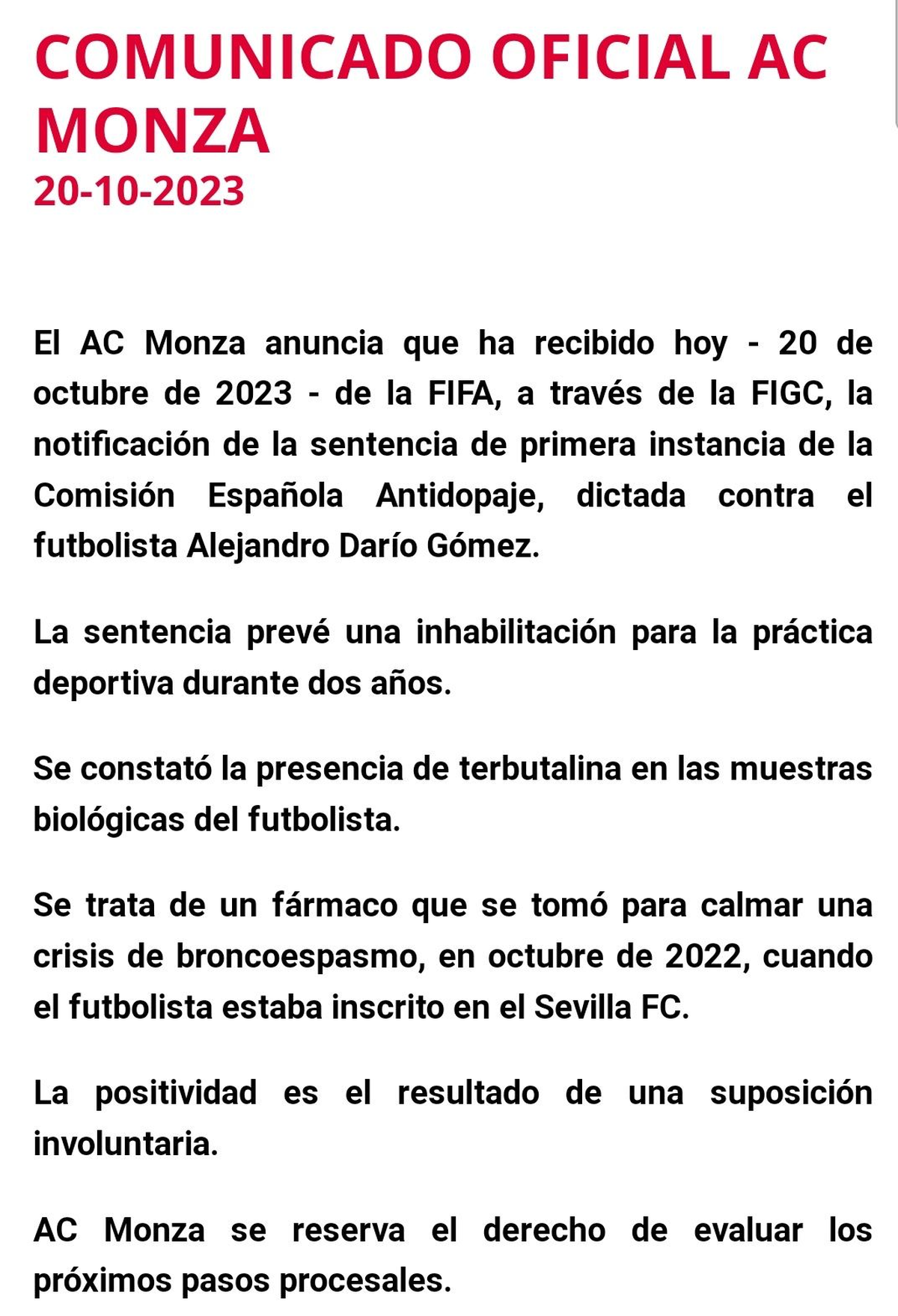 El AC Monza anuncia que ha recibido hoy - 20 de octubre de 2023 - de la FIFA, a través de la FIGC, la notificación de la sentencia de primera instancia de la Comisión Española Antidopaje, dictada contra el futbolista Alejandro Darío Gómez.
