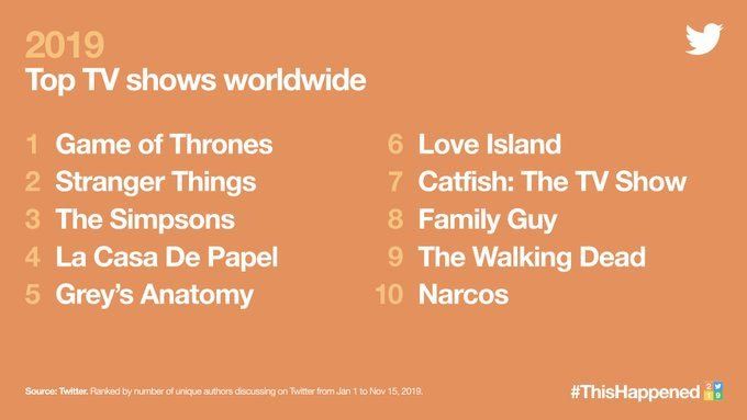 Una cuenta de Twitter llamada precisamente «Twitter Data» publicó hace unas horas los top 10 de series y de películas más comentadas del año por sus usuarios. Para sorpresa de nadie, Game of Thrones y Stranger Things lideran sus estadísticas. Por una parte, la ficción de HBO causó toda una oleada de memes y disconformidad con sus capítulos finales, mientras que la tercera temporada del programa protagonizado por Eleven y sus amigos dio lugar a infinidad de teorías que la conectaban con Chernobyl.
