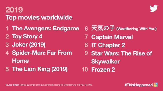 En cuanto a películas, cabe destacar que principalmente cobraron importancia obras «pochocleras» relacionadas con superhéroes, historias infantiles o de terror. El ranking lo lideran Avengers: Endgame, Toy Story 4, Joker, Spider-Man: Far from Home, The Lion King y Weathering With You. Esta última es el anime que representará a Japón en los Oscar.