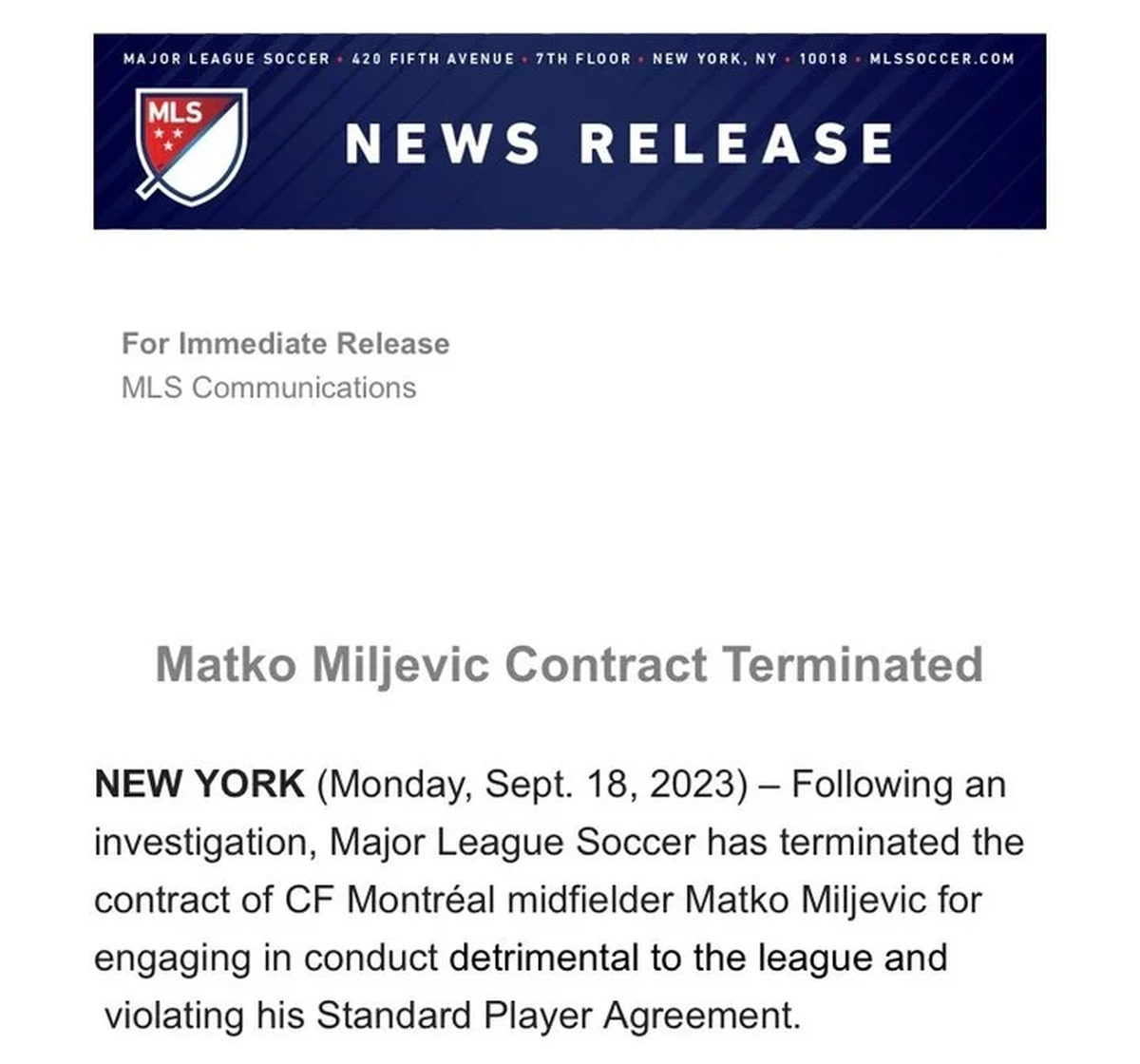En las últimas horas, la MLS tomó cartas en el asunto y resolvió rescindir el contrato de Miljevic con el equipo de Montreal. "Tras una investigación, la Major League Soccer ha terminado el contrato del mediocampista del CF Montreal, Matko Miljevic, por participar en una conducta perjudicial para la Liga y violar su acuerdo estándar de jugador", anunció la liga norteamericana en un comunicado oficial este lunes.