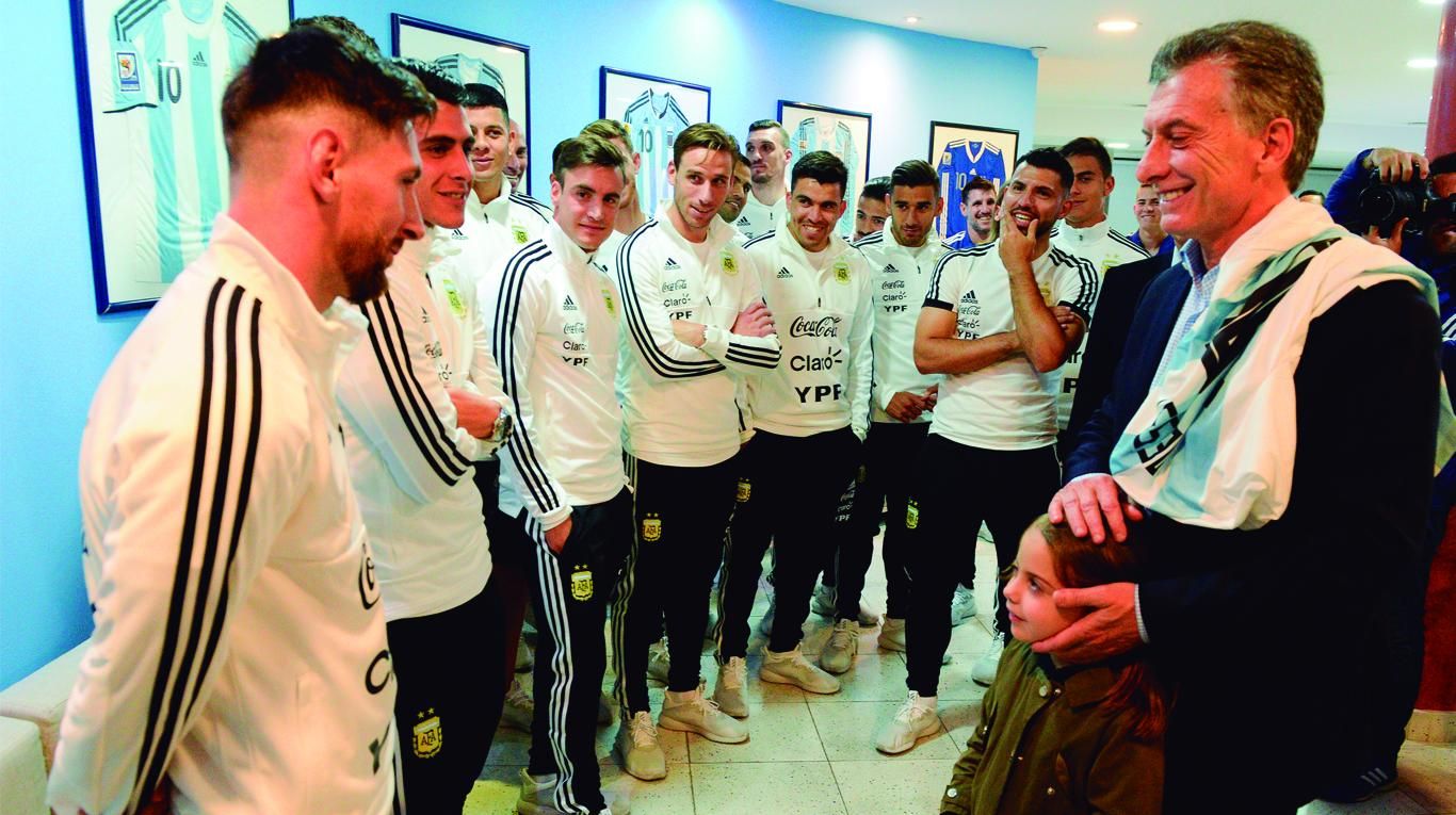 Momentos antes de subirse al micro que los trasladó al aeropuerto, Macri visitó a los jugadores junto a su hija Antonia. También estaban presentes Chiqui Tapia, presidente de la AFA, Daniel Angelici -mandamás de Boca- y Fernando de Andreis, Secretario General de la Presidencia.