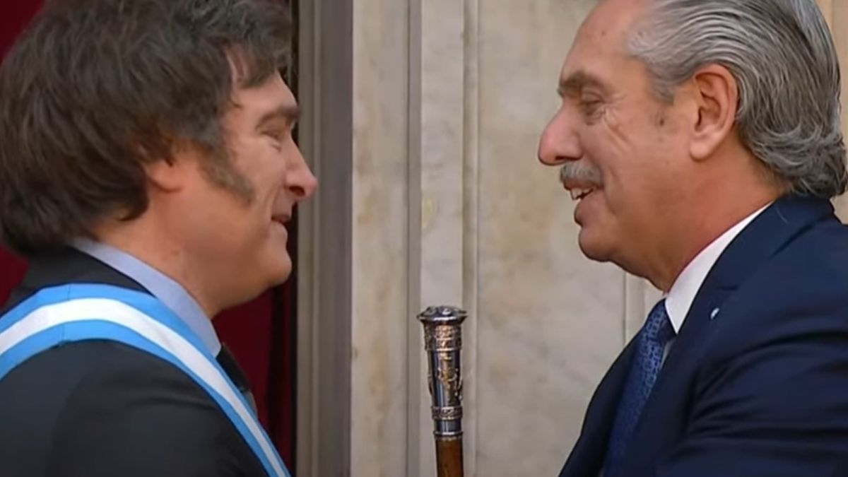 La toma del juramento fue hecha por la Vicepresidenta saliente tanto a Milei como a Villarruel pero la colocación de la banda presidencial y del bastón de mando fue entregada por el presidente saliente Alberto Fernández, con quienes se saludaron con amabilidad y con un fuerte apretón de manos.