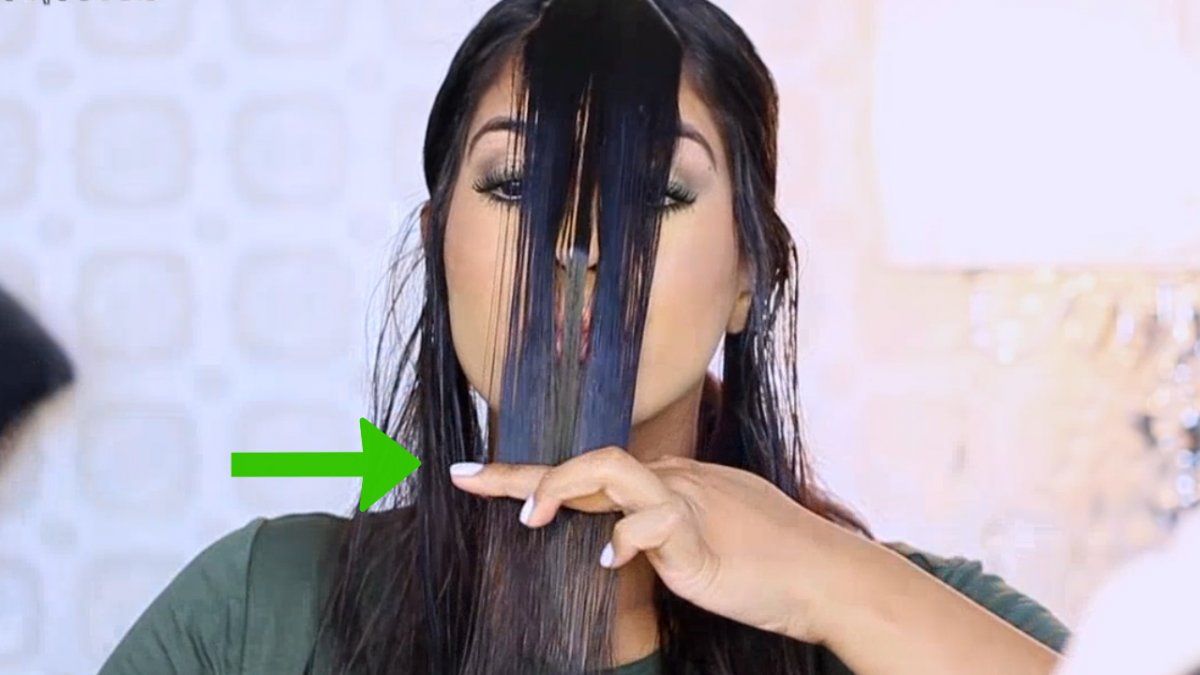 - Flequillo recto. Separá la parte del flequillo peinándolo hacia adelante y de mitad de ceja hacia la otra mitad de la ceja. Te queda un triángulo. El resto del pelo separalo con una gomita para no cortar de más. Con una tijera cortá recto sobre las cejas.