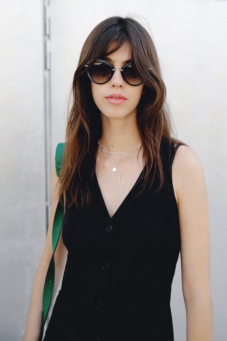 Otra gran opción paa acompañar a estas melenas enteras de las que hablábamos antes, son los falsos flequillos que dejan la frente despejada, pero dibujan dos líneas verticales en torno a ella. Se trata de dos capas cortas que no llegan a formar un flequillo completo, pero que crean un marco ascendente para que el rostro parezca mucho más estilizado.