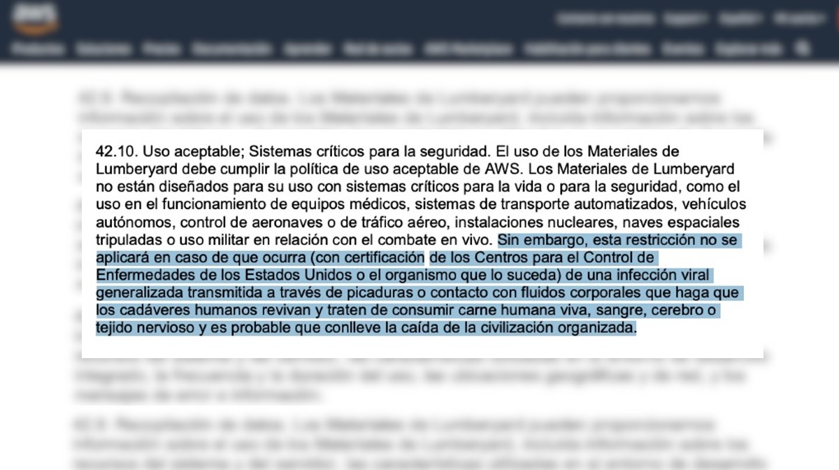 En la cláusula 42.10, actualizada el 3 de diciembre de 2021, Amazon autoriza el uso de Lumberyard si hay una “infección viral generalizada transmitida a través de picaduras o contacto con fluidos corporales que haga que los cadáveres humanos revivan y traten de consumir carne humana viva, sangre, cerebro o tejido nervioso y es probable que conlleve la caída de la civilización organizada“.