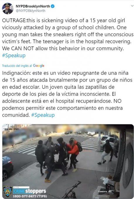 Un oficial al mando de NYPD Brooklyn North describió el ataque en un tweet como “indignante” y calificó de intolerable el comportamiento visto en el video de vigilancia.