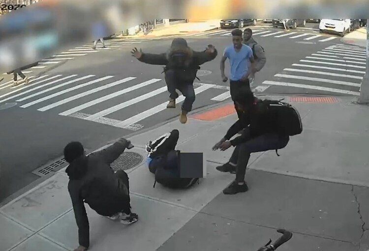 En algunos momentos de la grabación ni siquiera se puede ver a la víctima porque todos los agresores están sobre ella. Le robaron su tarjeta de débito además de zapatos y teléfono, dice la policía de Nueva York.
