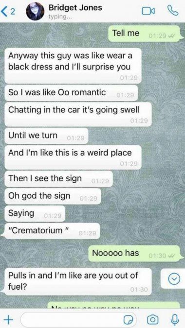 En un primer momento, ella pensó que irían a una elegante cena porque el joven le dijo que se vistiera de negro. Pero no todo ocurrió como esperaba. Ambos terminaron en el funeral de la abuela del chico: “Nos detuvimos en un extraño lugar hasta que vi la señal. Oh Dios, la señal decía ‘Crematorio’”, confesó la muchacha identificada como Bridget Jones.