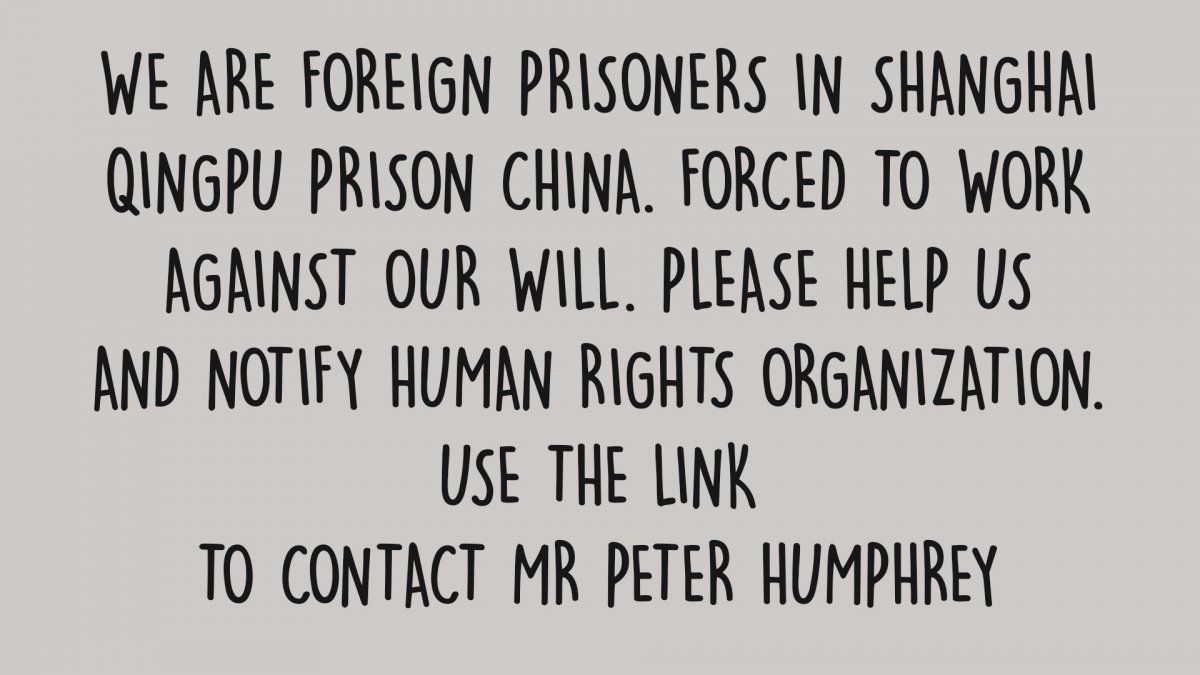 La nota decía “Somos prisioneros extranjeros en la prisión de Shanghai Qingpu, China, obligados a trabajar en contra de nuestra voluntad. Ayúdenos y notifique a la organización de derechos humanos. Use el enlace para contactar al Sr. Peter Humphrey.” La calicrafía fue modificada para proteger el anonimato de quien la escribió