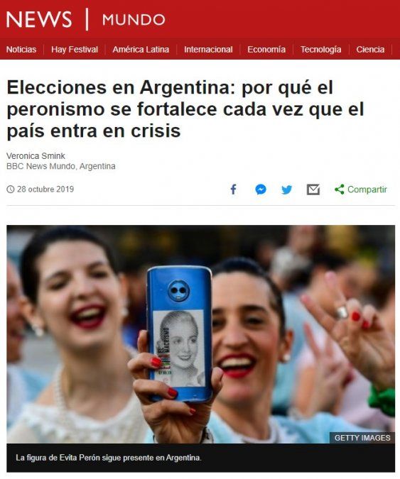 "El peronismo volvió al poder en Argentina: la victoria en las elecciones presidenciales de Alberto Fernández marca un nuevo capítulo para el movimiento que ha dominado la política argentina por 70 años", comienza el informe que la cadena emitió por su canal de Youtube. Daniel Pardo, enviado de la BBC Mundo a Buenos Aires, explica en siete minutos los cuatro ejes claves para explicar el resultado de las elecciones del pasado 27 de octubre. Cómo se origina el peronismo y cuáles han sido sus políticas históricas, por qué domina el escenario argentino, cuál es su habilidad política y por qué tiene tantos seguidores.