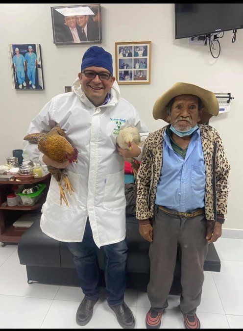 El médico Álvaro Ramallo Zamora relató que una hora después de realizar todo el trámite necesario para programar la cirugía, el adulto mayor regresó a su consultorio y solicitó verlo nuevamente para entregarle en sus propias manos dos gallinas como pago por su buena voluntad de ayudarlo. "Son para usted, es mi cariño", dijo el noble abuelito.