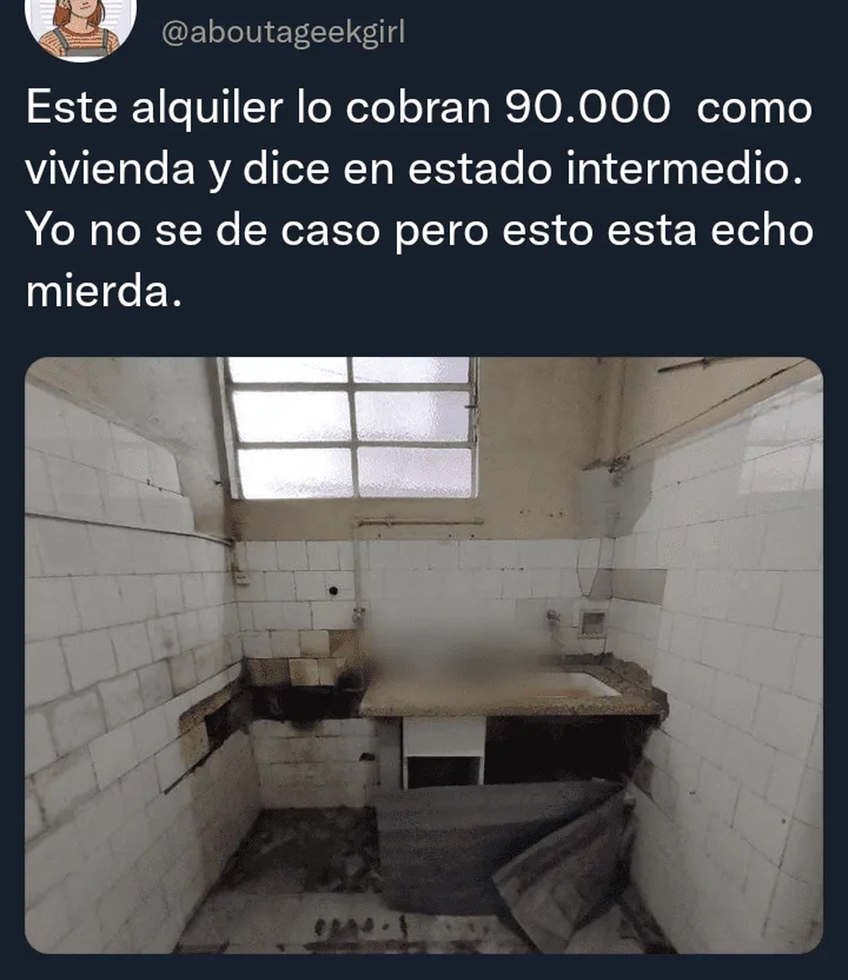 El pasado domingo, una usuaria de la red social, cuyo nombre de perfil es @aboutageekgirl, compartió las fotos de un PH que le llamó la atención: estaba destrozada y tenía un exorbitante precio. "Este alquiler lo cobran 90.000 como vivienda y dice en estado intermedio. Yo no sé de casas, pero esto está hecho mier...", escribió la joven. Rápidamente, el posteo despertó interés y las personas empezaron a pedir más datos. La propiedad está ubicada en el barrio porteño de Almagro, tiene 85 metros cuadrados, dos baños y tres dormitorios.