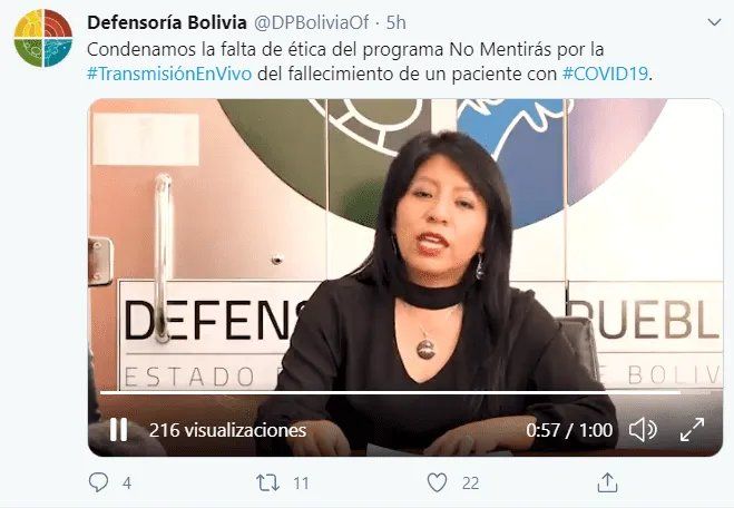 La Defensoría del Pueblo de Bolivia consideró una "falta de ética" la transmisión en vivo, con "imágenes que vulneran los derechos a la privacidad, intimidad, honra, honor, y transgreden la inviolabilidad de la dignidad".