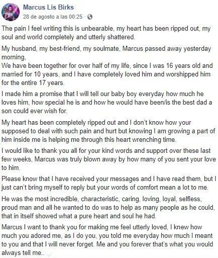 Tras conocer la terrible noticia, su mujer ha querido compartir en redes sociales un mensaje. "Mi esposo, mi mejor amigo, mi alma gemela, Marcus falleció ayer por la mañana. Hemos estado juntos durante más de la mitad de mi vida, desde que tenía 16 años y estaba casada durante 10 años, y lo he amado y adorado completamente por los 17 años completos", dijo su esposa en el perfil de Birks.