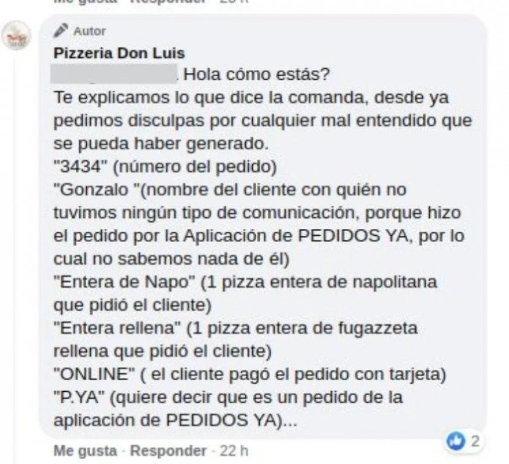 Sin embargo, la Pizzería Don Luis salió a aclarar lo que sucedió ante los comentarios que empezó a recibir en su página de Facebook. "Te explicamos lo que dice la comanda, desde ya pedimos disculpas por cualquier mal entendido que se pueda haber generado", escribieron en la red social.