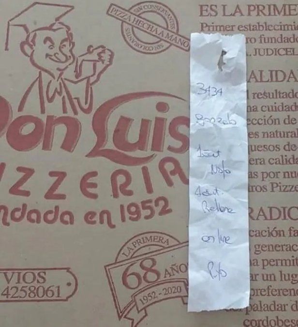 Este episodio se suma a otro que se hizo viral en las últimas semanas. Todo comenzó cuando un joven de nombre Gonzalo pidió un delivery en la Pizzería Don Luis en Córdoba. El cliente recibió su pedido en buenas condiciones y a tiempo, pero cuando comenzó a leer el ticket para verificar que le hubieran traído lo solicitado encontró una palabra que no esperaba.