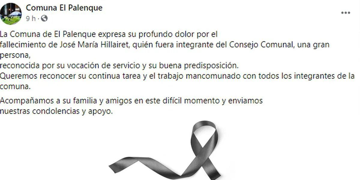 "La Comuna de El Palenque expresa su profundo dolor por el fallecimiento de José María Hillairet, quién fuera integrante del Consejo Comunal, una gran persona, reconocida por su vocación de servicio y su buena predisposición. Queremos reconocer su continua tarea y el trabajo mancomunado con todos los integrantes de la comuna. Acompañamos a su familia y amigos en este difícil momento y enviamos nuestras condolencias y apoyo".