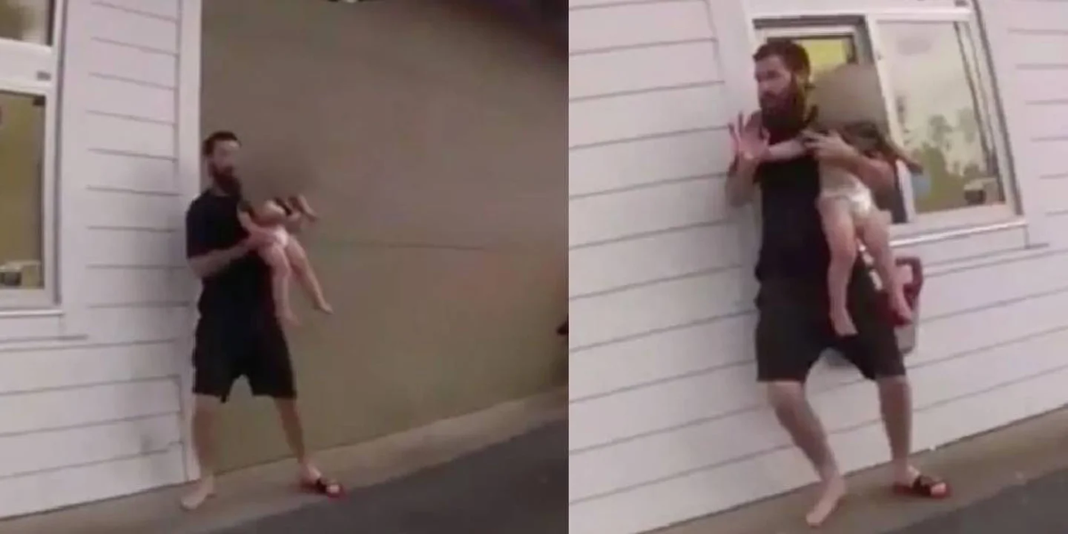 Los efectivos le ordenan que suelte al niño, pero él se niega. “Baja al bebé, baja al niño”, le grita un policía, pero al hacer caso omiso le disparan con una Taser (un arma de electrochoque que al ser usada sobre el cuerpo de una persona o animal la incapacita temporalmente) y lo dejan tumbado en el asfalto. El niño, que solo llevaba un pañal, también cayó al piso y fue rescatado de inmediato.
