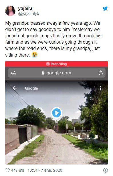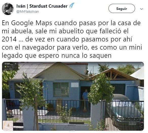 “En Gobogle Maps cuando pasas por la casa de mi abuela, sale mi abuelito que falleció el 2014… de vez en cuando pasamos por ahí con el navegador para verlo, es como un mini legado que espero nunca lo saquen“, escribió en Twitter.