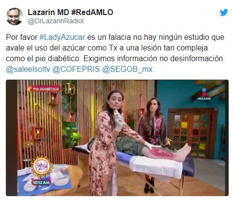 Mientras que otro expresó: “Por favor #LadyAzucar es un falacia no hay ningún estudio que avale el uso del azúcar como Tx a una lesión tan compleja como el pie diabético. Exigimos información no desinformación“.