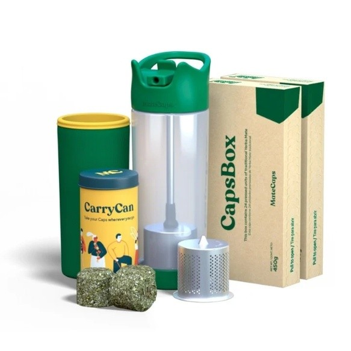 “Es un mate que se ceba solo, una opción práctica orientada a un público moderno y global”, explican sus creadores. El “Mate full pack” incluye la botella, el filtro para mate, un filtro adicional para té, una funda de neoprene, una lata para guardar las cápsulas y dos cajas 24 unidades de “matecaps” (una del blend tradicional y la otra con un surtido de los otros tres).