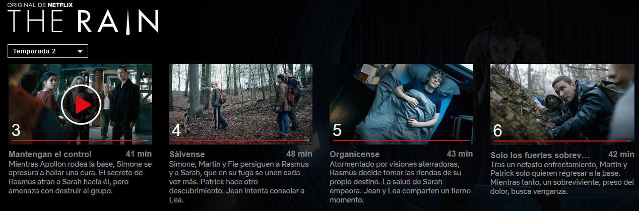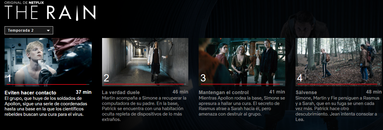 En las dos temporada de “The Rain” centran la trama en la confusión emocional y psicológica de Simone, que sufre varias crisis mientras trata de sobrevivir e intenta desentrañar de dónde vino el virus y las consecuencias que ocasiona.