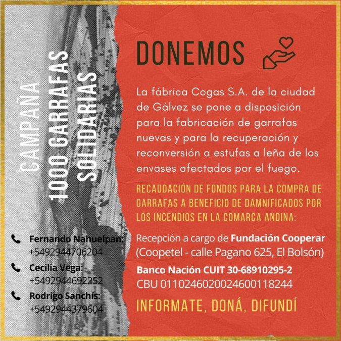 Rodrigo Sanchis nació y vivió en Santa Fe hasta 2004, cuando decidió emigrar hacia la Patagonia. Desde hace 17 años está radicado en El Bolsón. Las pérdidas generadas por los incendios forestales en Río Negro y Chubut movilizaron al santafesino a emprender junto a otras personas una campaña solidaria en busca de fondos para afrontar la compra de gas envasado. La idea es donar dos garrafas por familia, esperan reunir dinero suficiente para adquirir unas 1.000, aproximadamente. Las garrafas de gas trasladadas hacia la Patagonia serán adquiridas en la empresa Cogas S. A. de la ciudad de Gálvez.