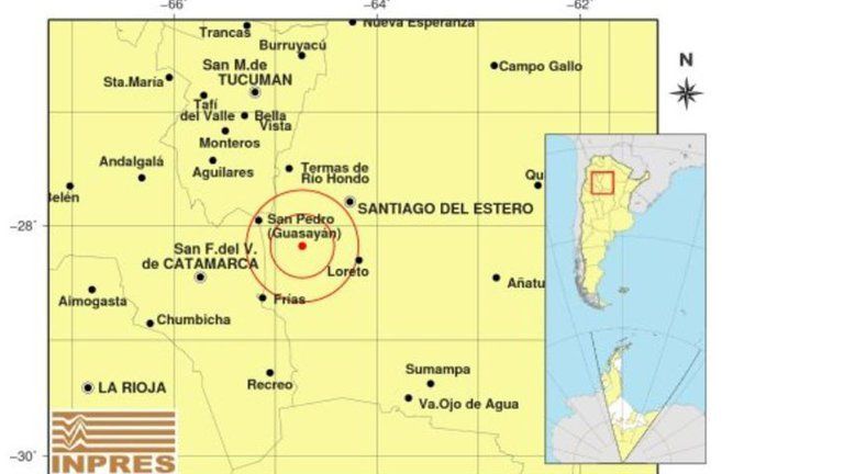 El epicentro del sismo fue a 64 kilómetros al SO de Santiago del Estero, a 103 kilómetros al E de San Fernando del Valle de Catamarca y a 49 kilómetros al SE de San Pedro de Guasayán, según el Inpres.
