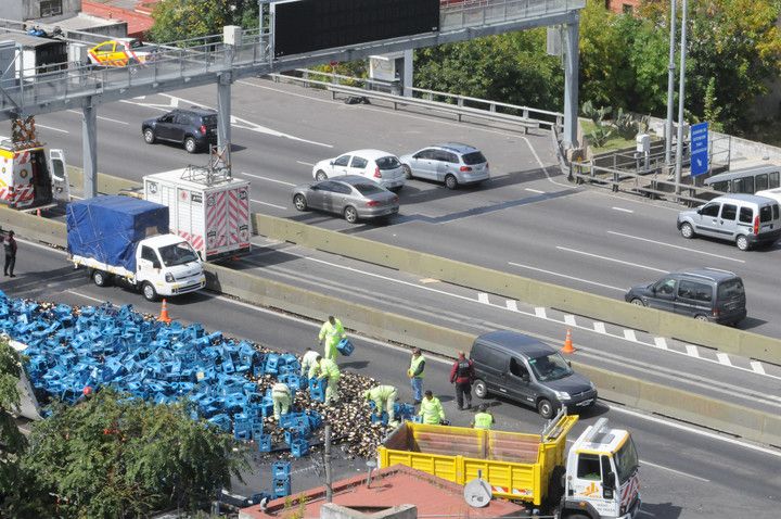 Los cajones con las bebidas quedaron desparramados sobre el asfalto y el tránsito estuvo totalmente detenido.