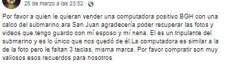 “A quien le quieran vender una computadora positivo BGH con una calco del submarino Ara San Juan agradecería poder recuperar las fotos y videos que guardo con mí esposo y mi nena”, posteó Ortiz en su cuenta en la red social Facebook.