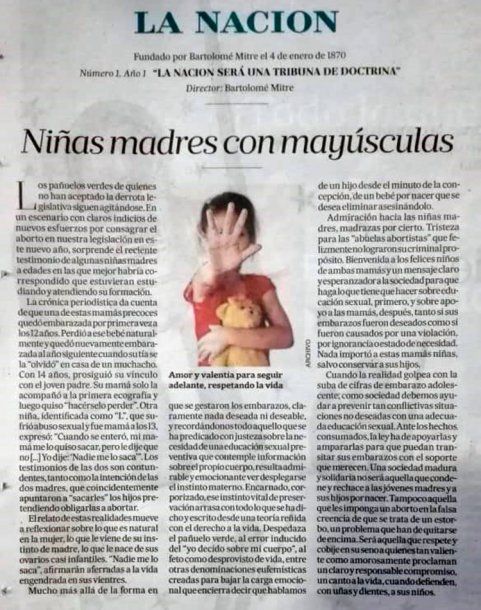 Este viernes el diario La Nación publicó una editorial en el que destaca, en líneas generales, la “valentía” con el que las nenas de 12 o 13 años deciden continuar con sus embarazos pese a la sugerencia y pedido de sus familiares en hacerse un aborto que, por cierto, es legal en casos de violación.