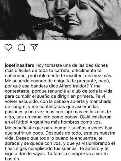 “Hoy tomaste una de las decisiones más difíciles de toda tu carrera, difícilmente te entiendan, probablemente te insulten una vez más. Te vi volver escupido, con la cabeza abierta, manchado de sangre y me contestabas que así eran las pasiones. Ojalá existieran en el fútbol argentino más hombres como vos. Me enseñaste que para cumplir sueños a veces hay que sufrir un poco”, reza parte del texto que publicó.