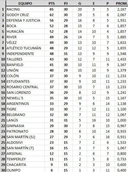 El conjunto que dirige Edgardo Coudet registró 65 puntos en los 30 encuentros disputados (20 triunfos, 5 empates y 5 derrotas) y quedó encima de Godoy Cruz con solo tres de ventaja. El que completó el podio fue el sorprendente Defensa y Justicia, con 56 unidades y un compromiso menos.
