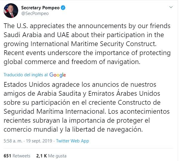 Tras la reunión, Pompeo publicó en su cuenta de Twitter un mensaje agradeciendo la creciente participación en seguridad marítima internacional a Arabia Saudita y los Emiratos Árabes Unidos, para proteger el comercio mundial.