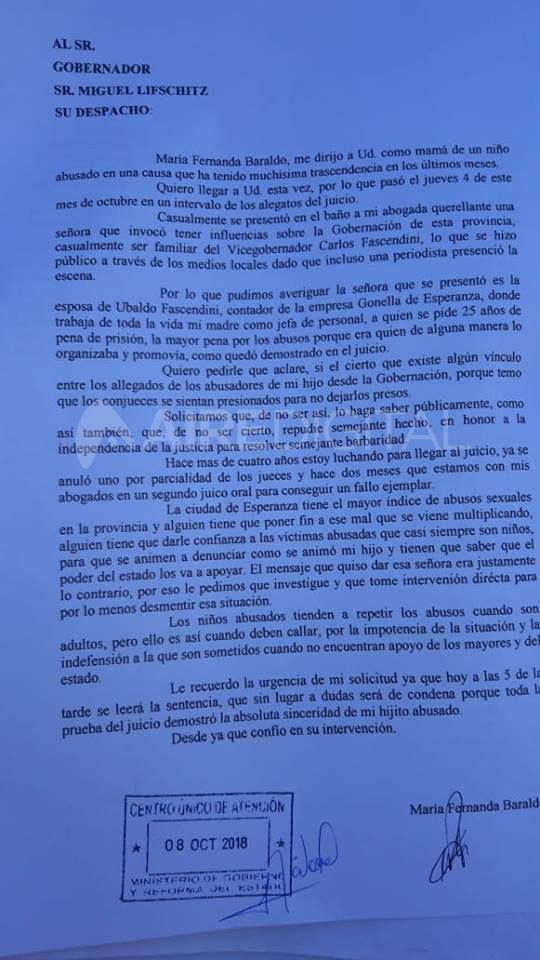 La Carta presentada por Maria Fernanda Baraldo al Gobernador Miguel Lifschitz