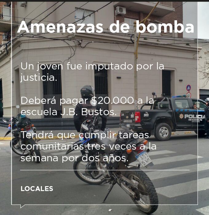 Las amenazas de bomba no solo tienen lugar en las escuelas primarias y secundarias de la ciudad sino que también en otros establecimientos de la ciudad. Tal fue el caso de un hombre que cursa la carrera de enfermería, quien también fue procesado por realizar la llamada con la posterior amenaza y ahora deberá pagar una multa y realizar tareas comunitarias. “Hará lo propio con sus conocimientos de enfermería en el lugar que le fuese asignado”.